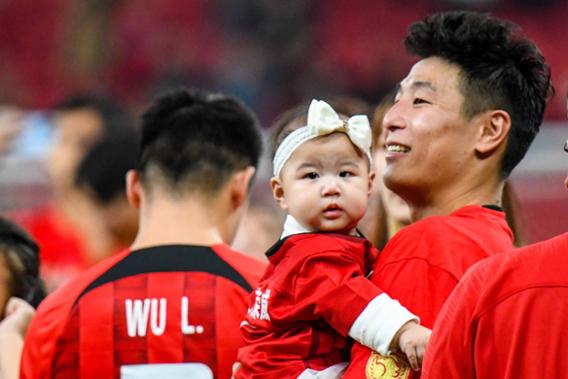 武磊带着小女儿一起庆祝。劳动报记者颜筱依 摄影