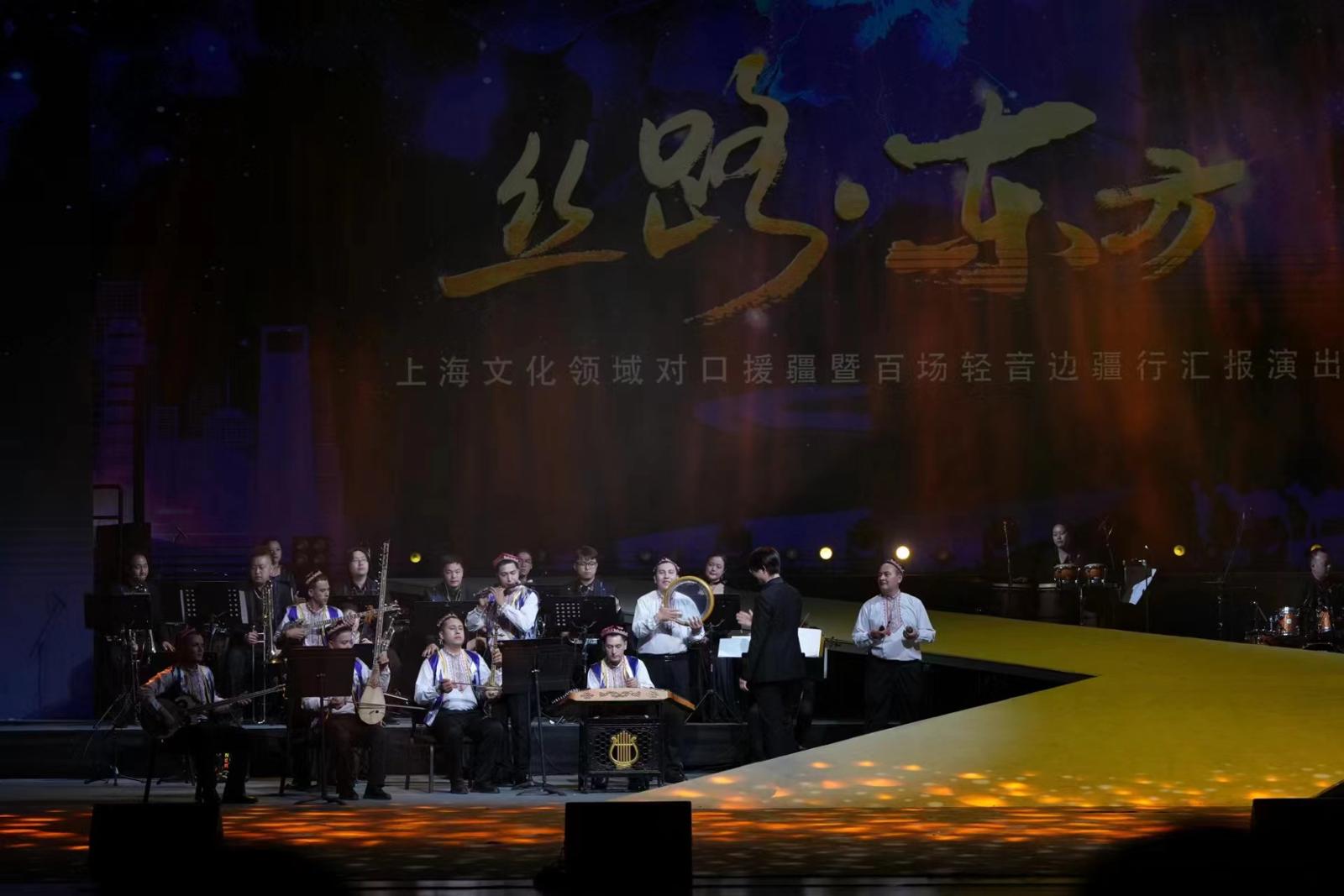 一条“丝路”连接过去和未来,一台歌舞共忆沪疆两地情!日前, “丝路·东方——上海文化领域对口援疆暨百场轻音边疆行汇报演出”在上海北外滩友邦大剧院举行。沪喀两地艺术家同台献艺,通过音乐、舞蹈、情景剧、海派皮影戏等丰富表演形式,尽展上海文化领域的援疆成果。