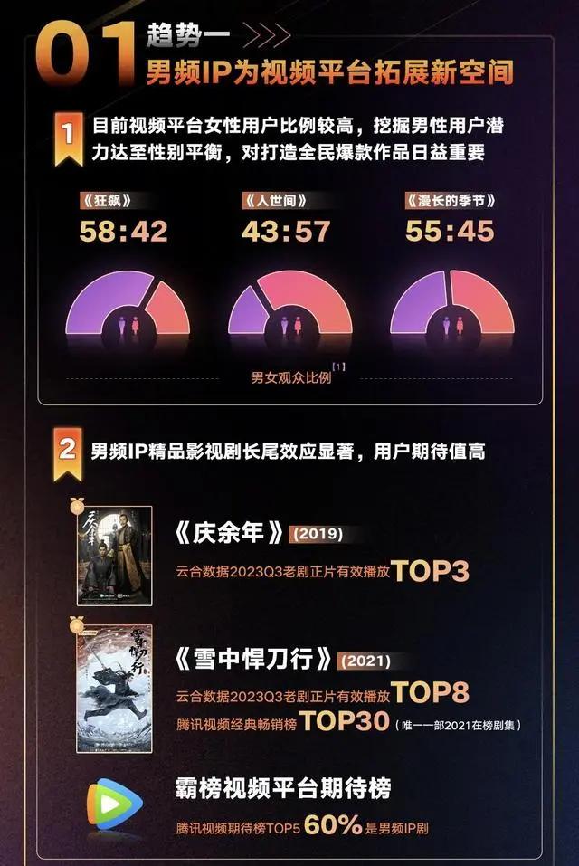 2023年先后涌现了《狂飙》《三体》等现象级影视作品,点燃了创作团队和市场对男性观众内容需求的高度关注。11月20日,阅文集团发布了《2023IP风向标》,总结了2023年IP产业的五大趋势,其中就包括“男频IP为视频平台拓展新空间”,未来挖掘男性观众的收视需求对打造全民爆款作品日益重要。