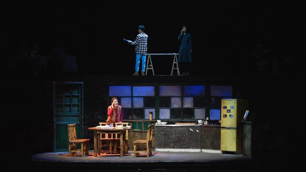 剧中除了一首首原创歌曲呼唤亲情,剧目舞台也富有设计感,构建了多重演剧空间,并巧妙运用纱幕来进行场景切换,给观众足够的审美和想象空间。