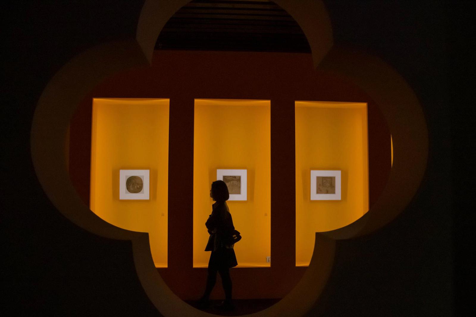 此外,展览的展陈设计令人耳目一新。设计者将展厅划分为多个空间,这些空间之间既相互独立,又相互连通。达·芬奇领衔的18幅西方艺术作品位于主轴线上,18幅中国的绘画作品则以半包围形式围绕其展开叙事。透过一扇花窗、一道拱门,中西方绘画遥相呼应,突出“对话”,也增加“曲径通幽”的意境之美。