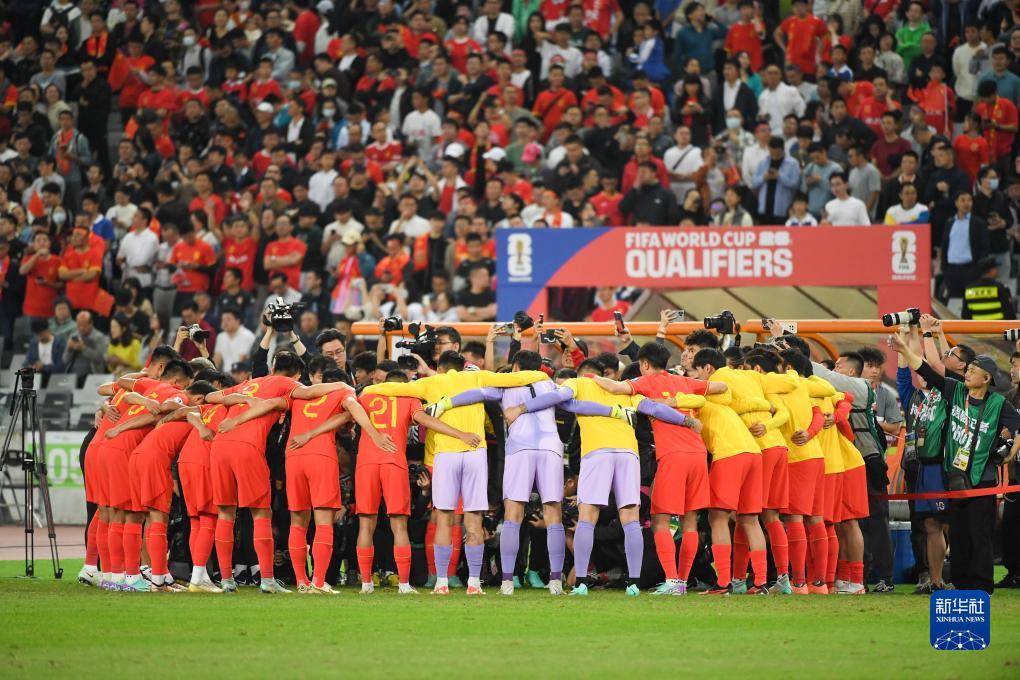 国足之前参加世预赛时全队一起加油打气。新华社图