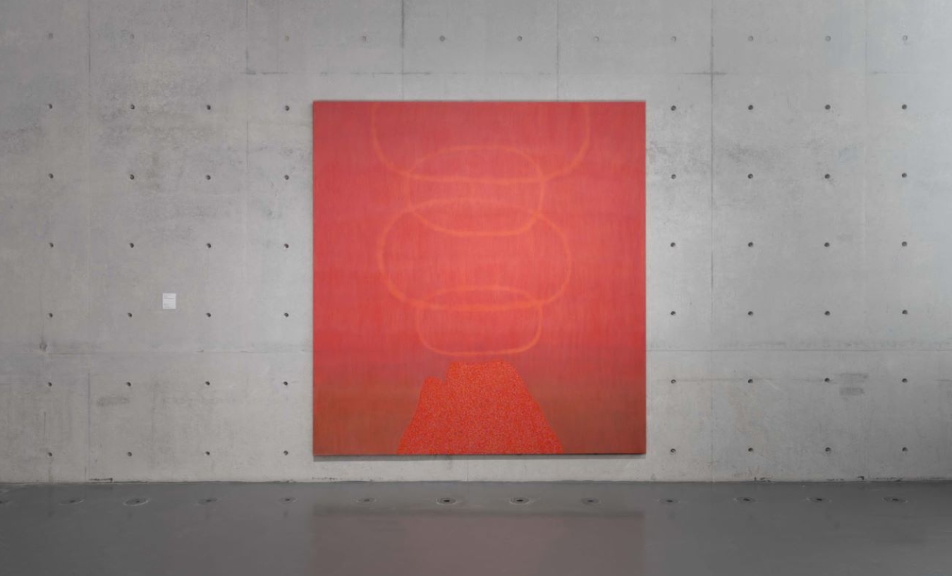 与“摆渡人”系列同时展出的还有一系列圆形画作。这些作品的颜色徘徊于明艳的黄色、粉色和深紫色之间,乍一看仿佛巨大的瞳孔或太阳的球状扩张。每副画作的笔触都向内伸展,就像“摆渡人”作品中那些难以描述的形象一样,这些圆形画作似乎在体现或召唤一个遥远的星球。