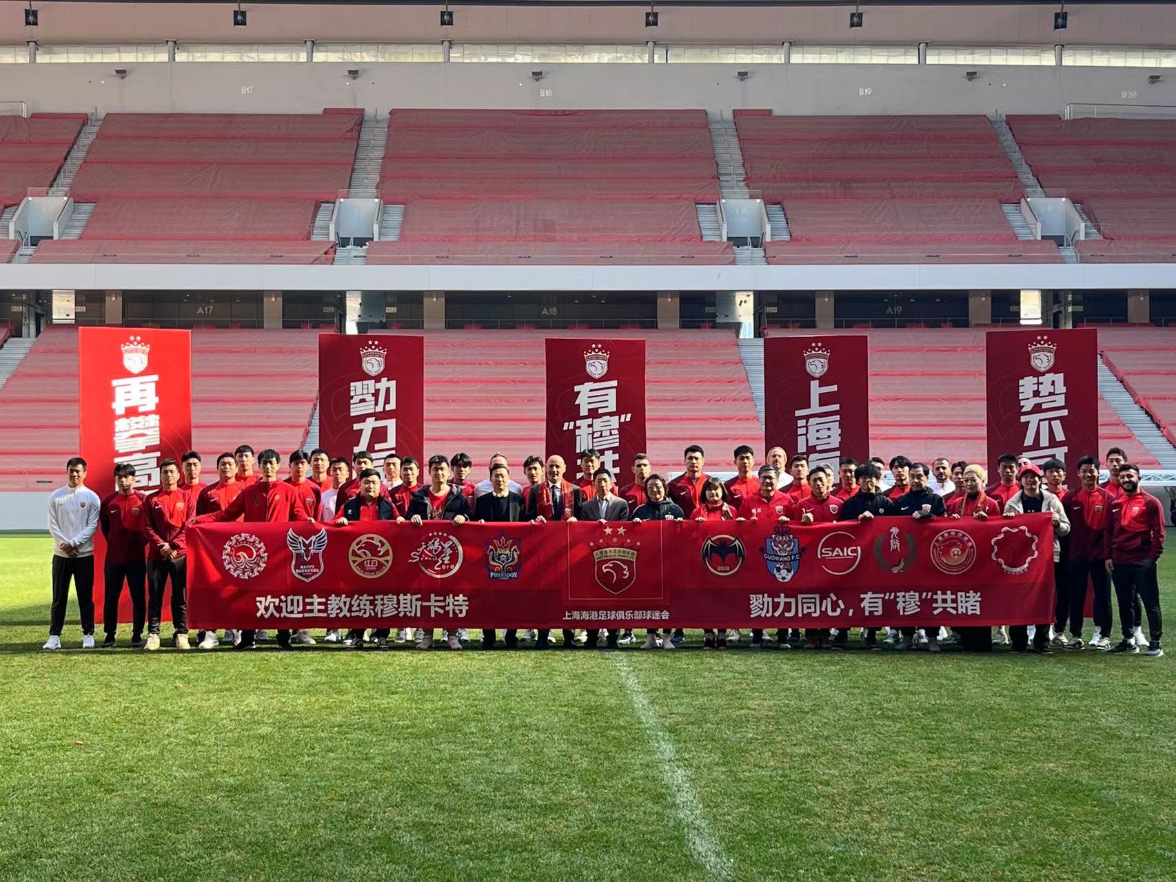 如同之前没有安排接机一样,海港俱乐部为穆斯卡特安排的见面会以“勠力同心,有‘穆’共睹”为主题。在发布会结束之后,球场内的欢迎仪式简约而不简单,球员们在烟雾中率先出场,然后列队欢迎穆斯卡特的教练团队依次进场。