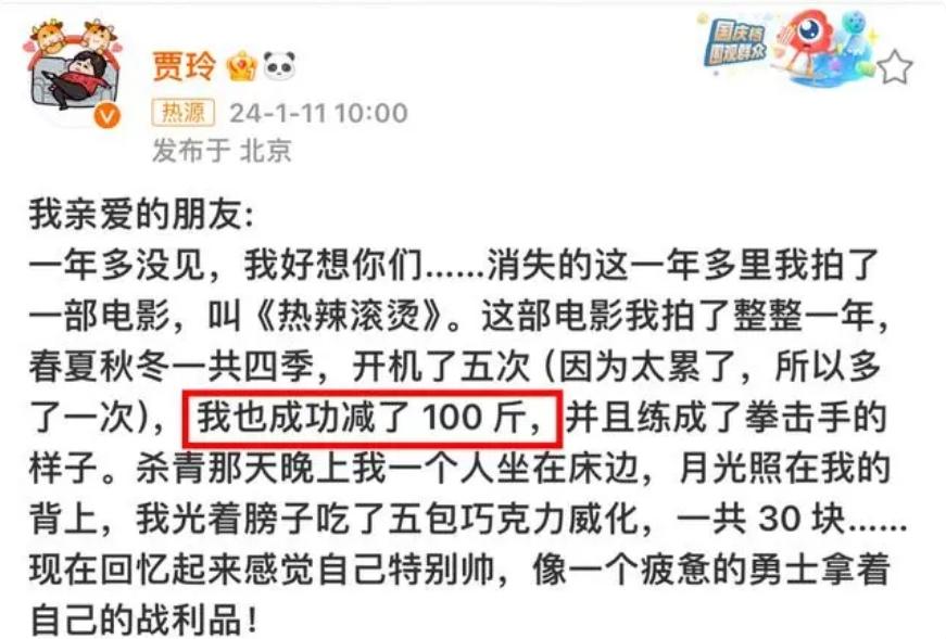 贾玲通过微博宣布自己成功减肥。贾玲微博图
