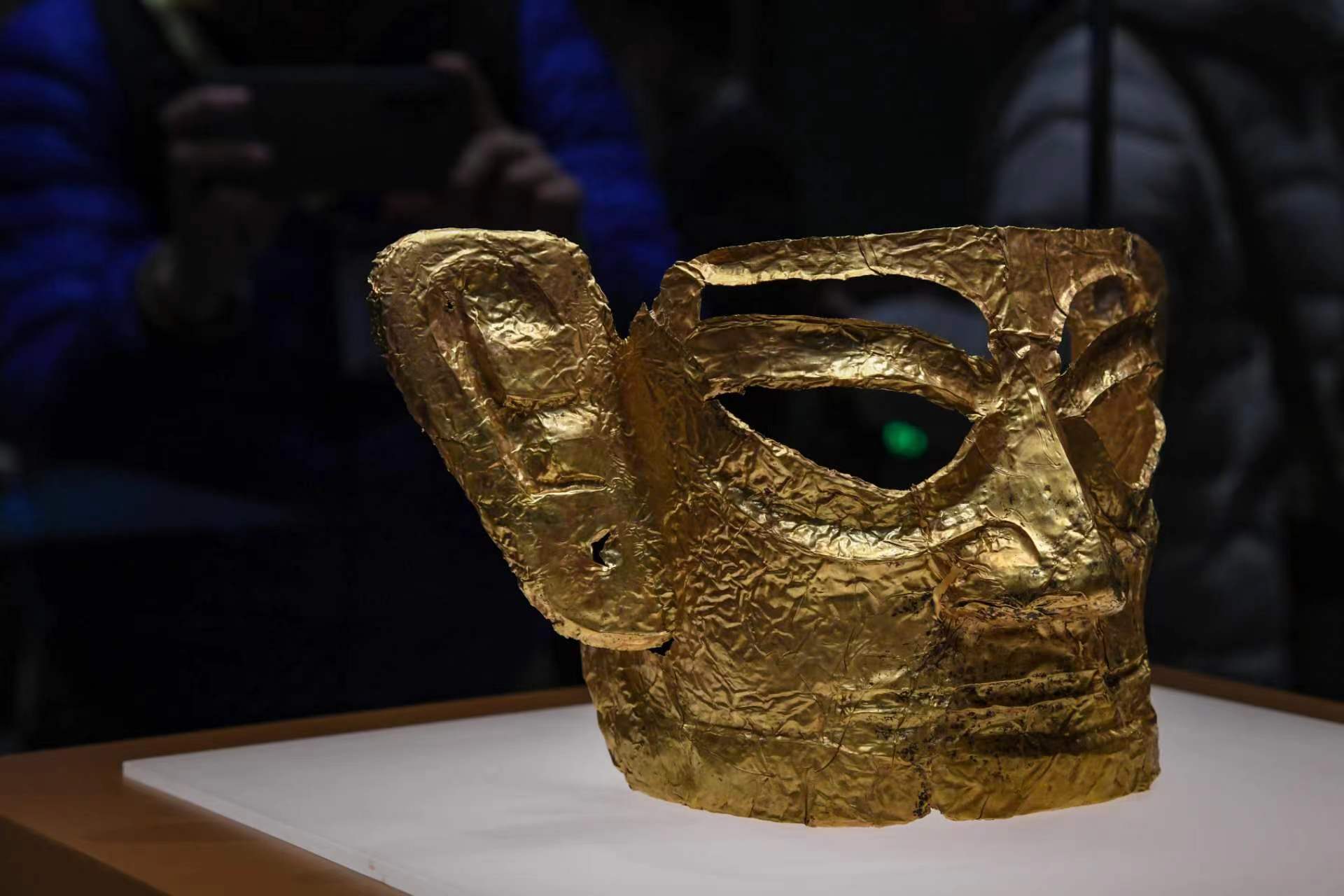 三星堆出土文物“金面具”。劳动报记者颜筱依 摄影
