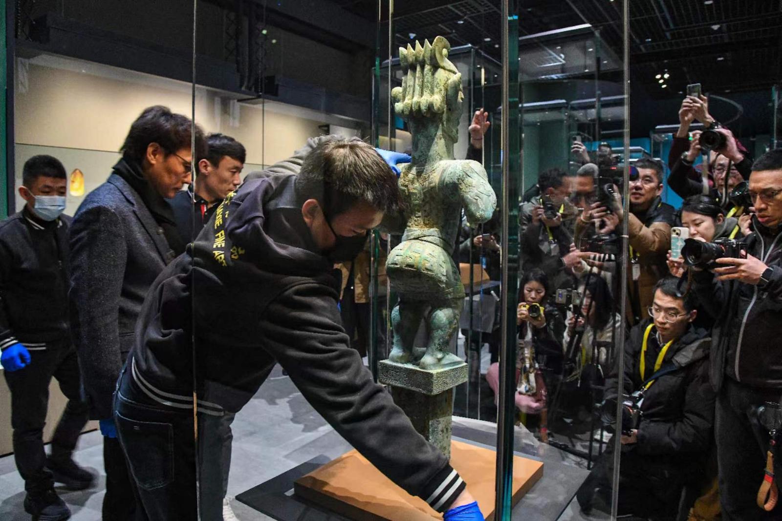 竖披发青铜人像布展现场。劳动报记者颜筱依 摄影