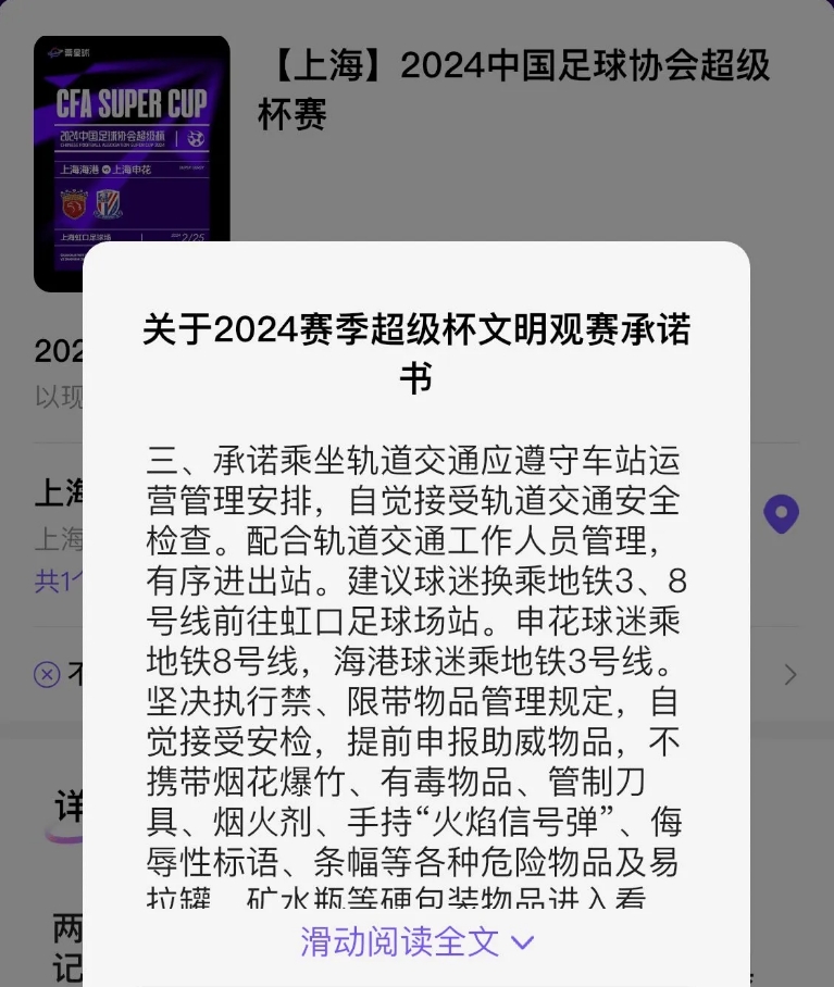 2月18日,2024赛季中国足协超级杯上海海港对阵上海申花的门票开售,售票网站发布的 《关于2024赛季超级杯文明观赛承诺书》提到,建议两队球迷不要乘坐同一班地铁前往虹口足球场,建议申花球迷乘坐8号线,海港球迷乘坐3号线。这样的方式,也是较为罕见。