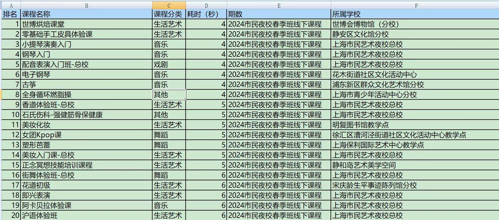 记者查询后台数据发现,今年报名耗时最短的前20门课程中,生活艺术类最受欢迎,比如世博烘焙课程、零基础手工皮具体验课都是4秒售罄,美妆化妆、花道初级、即兴表演、沪语体验班等也都在6秒内被抢光。