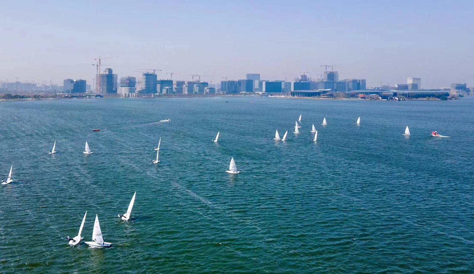 数十只船帆在滴水湖中竞逐。劳动报记者贡俊祺 摄影
