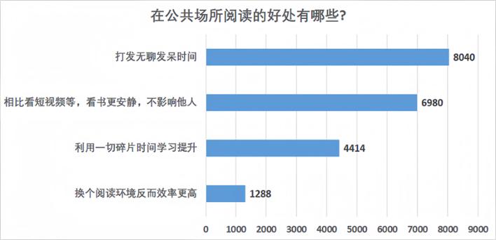 利用出行时间看书带来的好处也显而易见。劳动报受访读者中,有8000人出于“打发无聊发呆时间”,还有近7000人认为“相比看短视频等,看书更安静,不影响他人”,“利用一切碎片时间学习提升”也是主要原因之一。