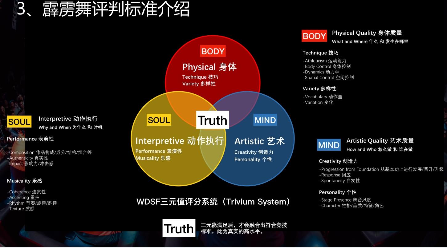 其中,技巧考核选手的运动能力、身体控制、动作能量、空间意识和形态;多样性考核选手的动作数量和变化;原创性考核选手的即兴、创新、自发性和个性;完整性考核选手的动作干净、近乎零失误、flow的一致性;音乐性考核选手的同步性、节奏/旋律/韵律、质感。