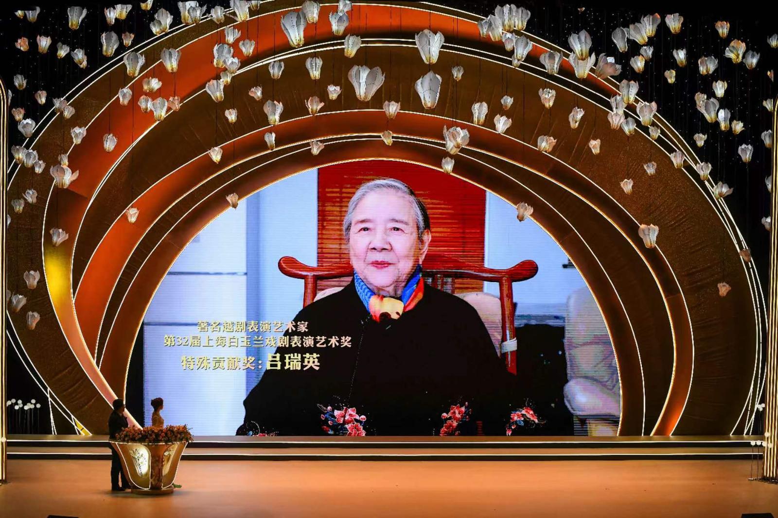 今年白玉兰戏剧奖将特殊贡献奖颁发给92岁高龄的越剧表演艺术家吕瑞英。吕瑞英,越剧“吕派”艺术创始人,国家一级演员,国家级非物质文化遗产项目代表性传承人,曾任上海越剧院院长、上海市戏剧家协会副主席。其戏路宽广,专长花旦,兼擅花衫、青衣、刀马旦。音色甜美,音域宽广,在汲取袁(雪芬)派委婉典雅、细腻隽永风格的基础上,增加了活泼娇美、昂扬明亮的旋律色彩,因而独树一帜、自成一格。