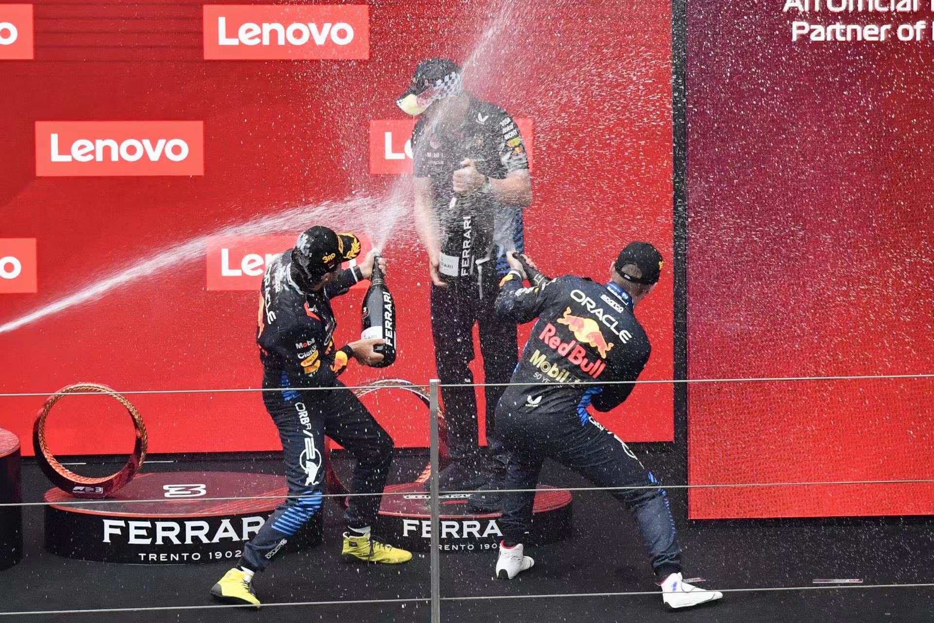 狂洒香槟。维斯塔潘首次夺得中国站冠军,他和他所在的红牛车队依然是“火星车”一般的存在。劳动报记者贡俊祺 摄影