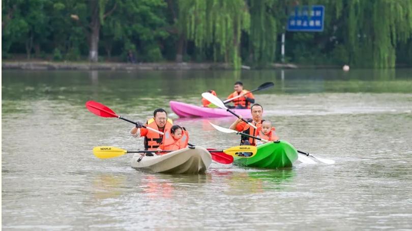 “水上夺标赛”要求一位家长和一个小朋友配合,共同滑动皮划艇,完成全部赛程。水面上,皮划艇奋勇向前,桨板激起的层层浪花与孩子灿烂的笑容交相辉映,而岸边的家庭早已摩拳擦掌跃跃欲试。