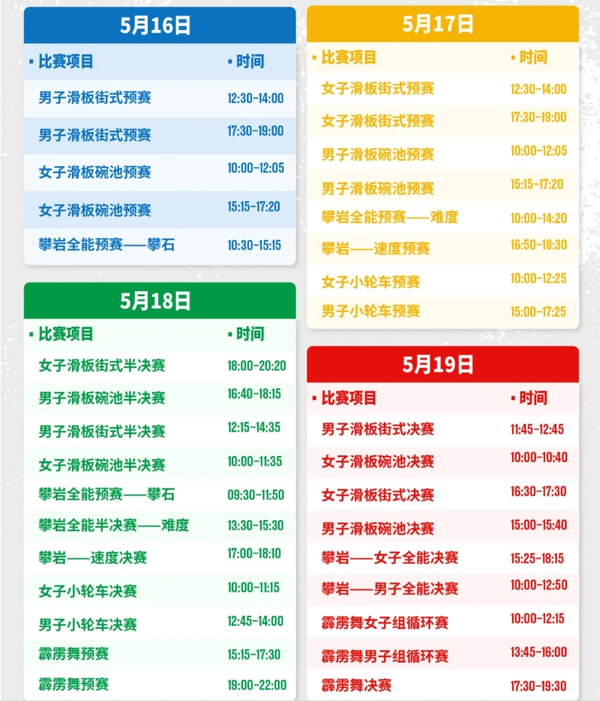 5月16日至19日,城市体育节的热度也将达到高潮。届时,城市公园内的“五大圈”体验区由自由式小轮车、滑板、霹雳舞和攀岩的展玩圈,和主舞台嘉年华欢乐圈组成。在4项运动展玩圈中,开启全天循环体验的常规活动,包括文化展览、专业教练现场指导、与参赛选手互动、城市运动知识趣味问答、运动炫酷技巧讲解及展示、拍照打卡留念等。