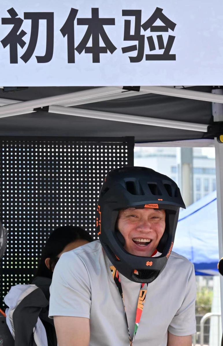 范志毅戴上小轮车头盔很有喜感。新华社图