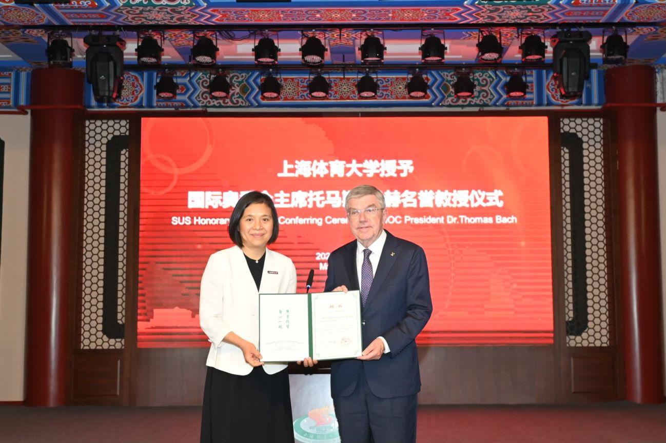 5月19日,上海体育大学隆重举行仪式,授予国际奥委会主席巴赫名誉教授。上海体育大学校长毛丽娟为巴赫颁发上海体育大学名誉教授聘书。国家体育总局局长高志丹、上海市副市长解冬等领导与嘉宾出席仪式。
