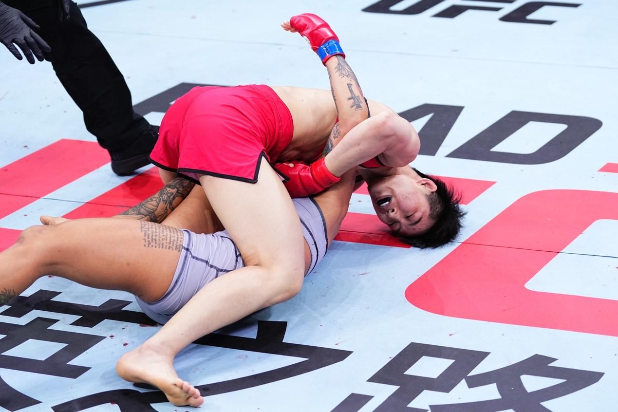 在女子蝇量级的一场激烈争夺中,散打出身的中国选手王聪在比赛开始没多久就以一记干脆的接腿摔放倒卢娜。她从半防位逐渐转换到侧控,然后通过翻滚拿到骑乘位断头台,对手无法挣脱只有拍地认输。