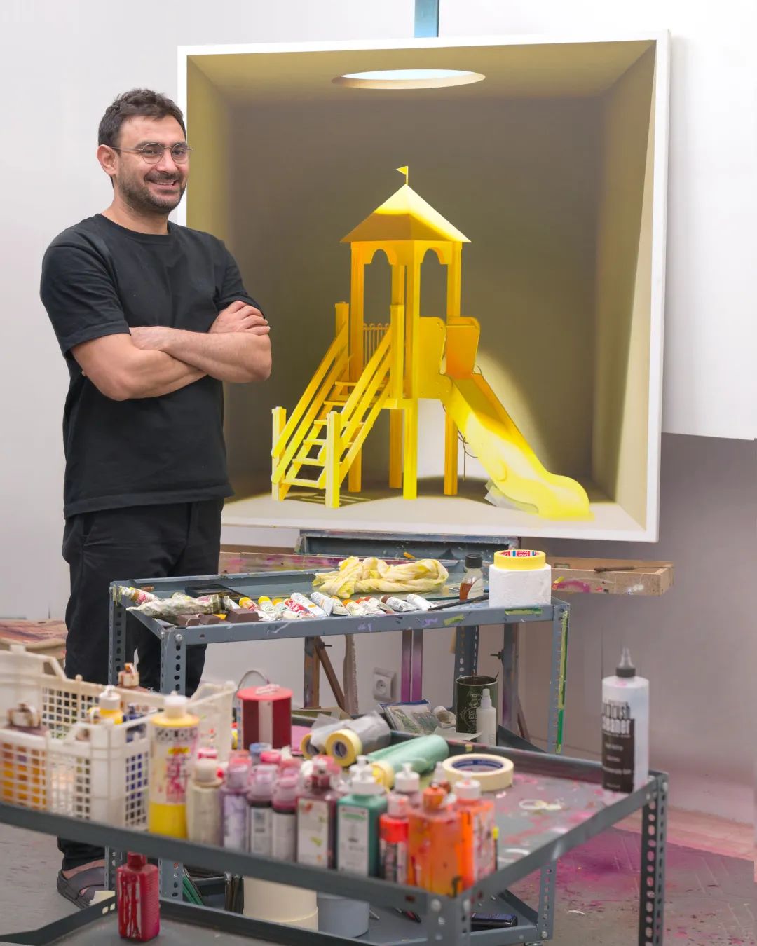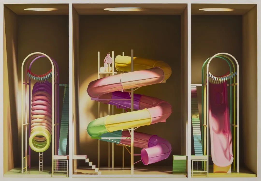 在展出的近作中,哈迪扬卢描绘了一组不同大小、形态各异、色彩绚烂的儿童游乐器械——滑梯和木马。它们大多被安放在一个类似橱窗的盒子里,在顶光的衬托下,这些作品充满了超现实感和象征意味。哈迪扬卢始终坚信艺术和绘画的力量,他认为,艺术不仅可以治愈人们的焦虑、忧郁和恐惧,还像一把火炬,照亮了整个社会。