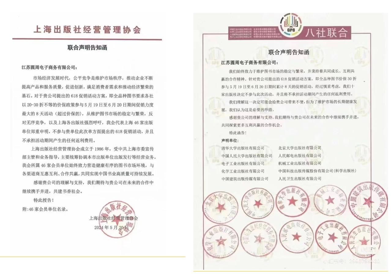 细看两份声明,都对于京东方面提出的618促销活动方案,即全品种图书要求各社以2-3折不等的价保政策,参与5月19日至6月20日期间促销力度最大的8天活动(超过价保的)给予了否定和拒绝态度。