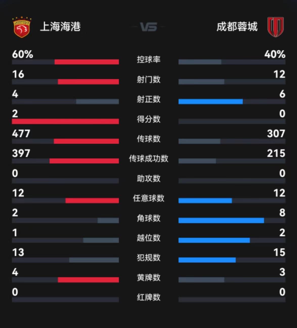 整个上半场,海港获得6次射门,成都蓉城4次,在长补时成为常态的情况下,上半场只有1分钟伤停补时,两支球队节奏很快,没有辜负中超双红会的赞誉。