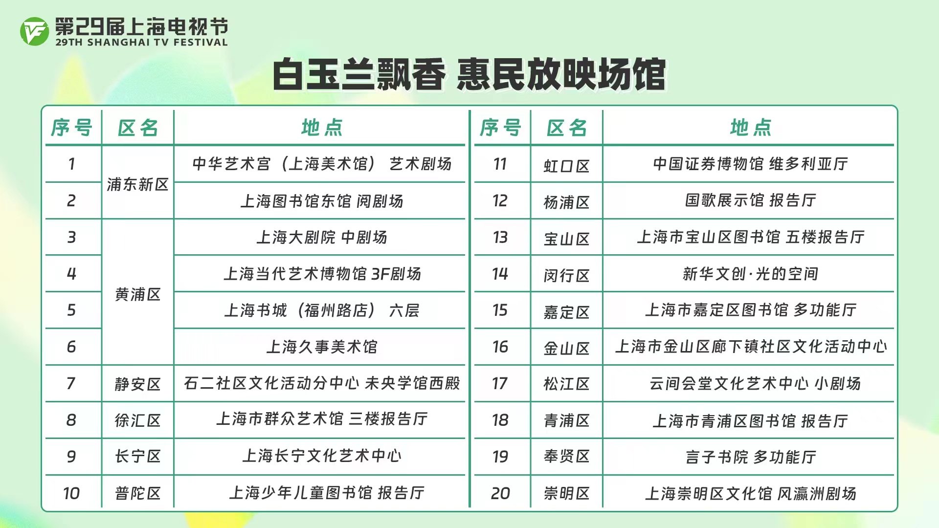 值得一提的是,本届电视节“白玉兰飘香”线下惠民放映活动将升级扩容。去年,中华艺术宫、上海当代艺术博物馆、滨港商业中心今潮8弄、上海市群众艺术馆、上海市少年儿童图书馆(新馆)、嘉定区图书馆、奉贤博物馆、松江云间会堂文化艺术中心等18个惠民放映点,均成为深受市民欢迎和喜爱的“网红打卡地”。