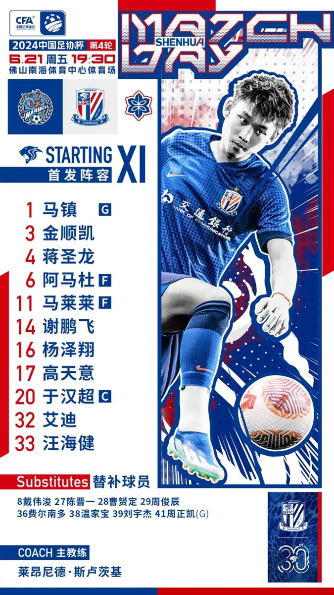 申花的对手是中甲球队佛山南狮。虽然对手联赛级别比自己低,但因为可以使用三名外援,申花并没有任何怠慢,主帅斯卢茨基带上了不少主力,谢鹏飞、高天意、蒋圣龙等国脚以及外援马莱莱、阿马杜均首发出场。