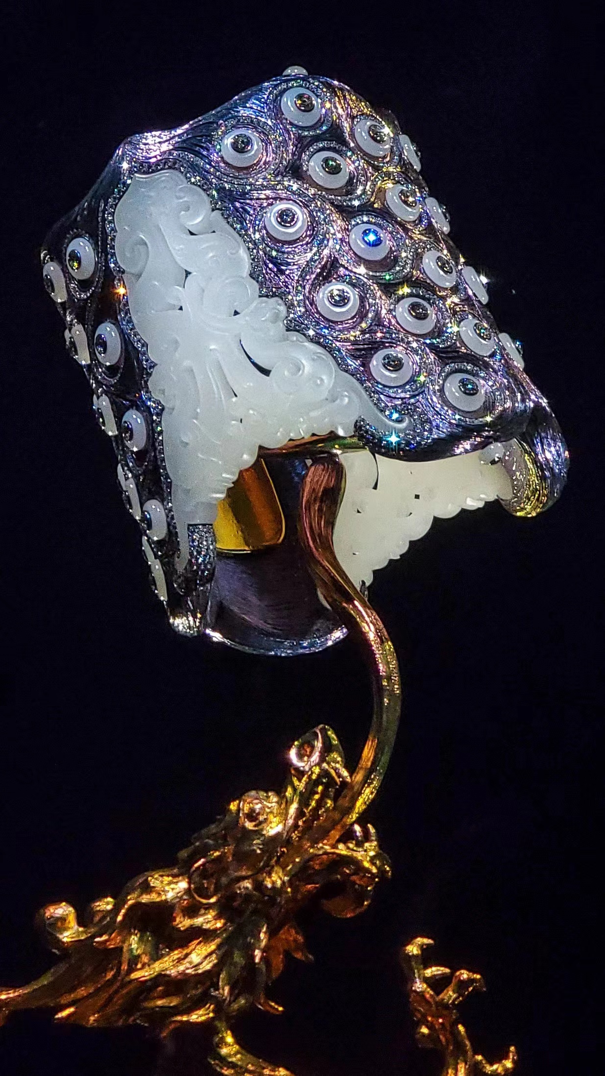 另一件作品《王者归来》已入藏上海博物馆,以羊脂白玉、钻石、钛金属为主材,结合了西方现代绘画的繁星点点和中国战国时期的玉雕工艺。古今兼容,中西并蓄,传神而传奇。温润的白玉与璀璨的钻石形成对比,恰似阴阳互助调和。