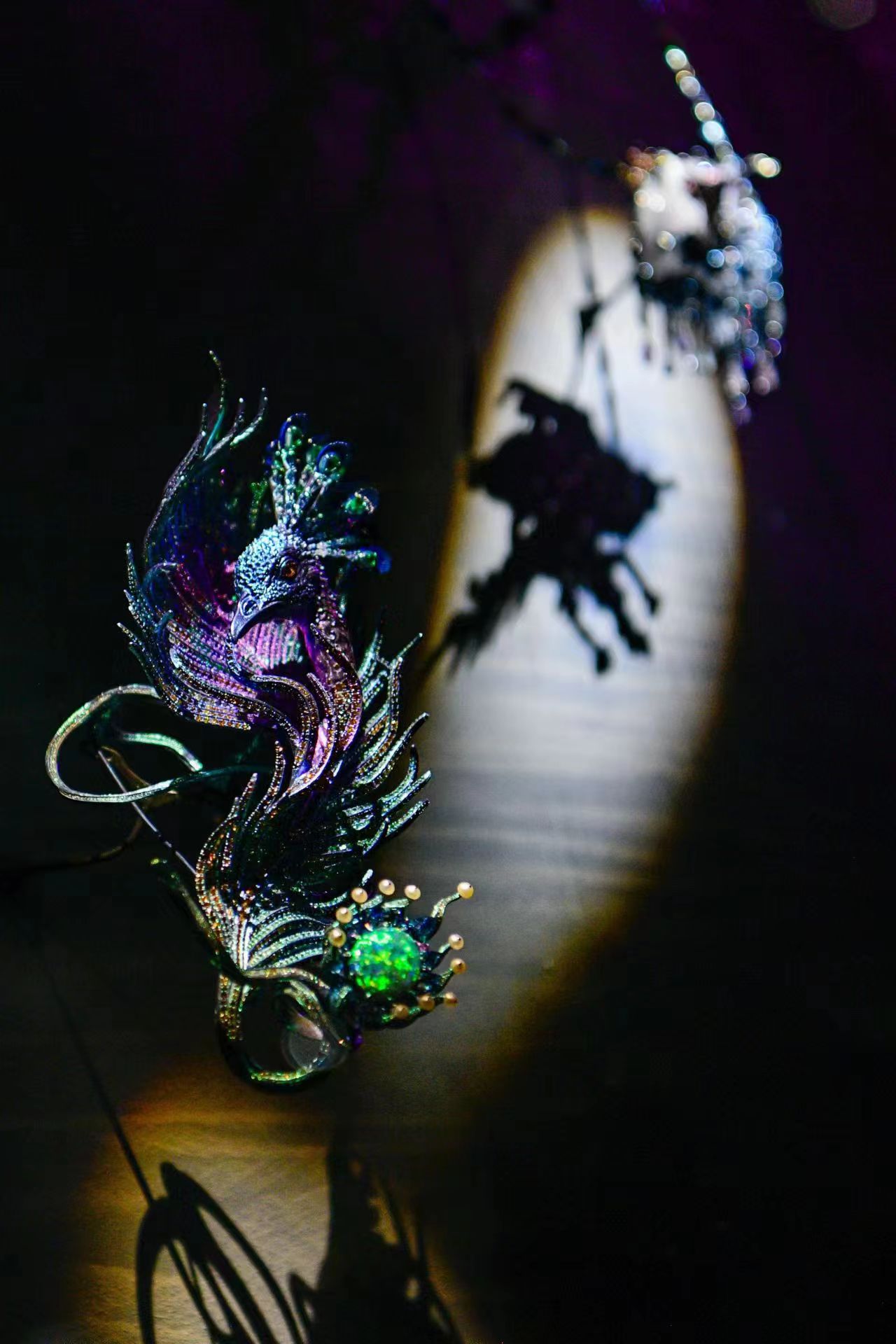 例如,作品《蝴蝶星云》运用钛金属结合微雕祥云纹路,镶嵌闪钻和彩色宝石,呈现出宇宙的壮丽与神秘。作品《化蝶》捕捉蝴蝶美好的色彩,利用水晶高折射的特质,配以各种宝石和贵金属,使其在自然光下展现出独一无二的璀璨光芒,美态足以媲美真实蝴蝶。