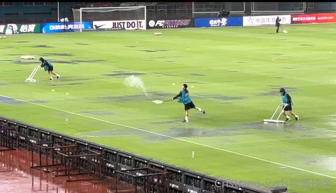 在如此情况下,海港飞赴郑州准备这场比赛,明显有些心事重重。不巧的是,郑州又恰逢暴雨,场地积水严重,中国足协不得不做出比赛延迟30分钟开球的决定。通过现场的图片和视频画面可以看出,场地如同一片稻田,工作人员在开赛前忙着往场外铲水。