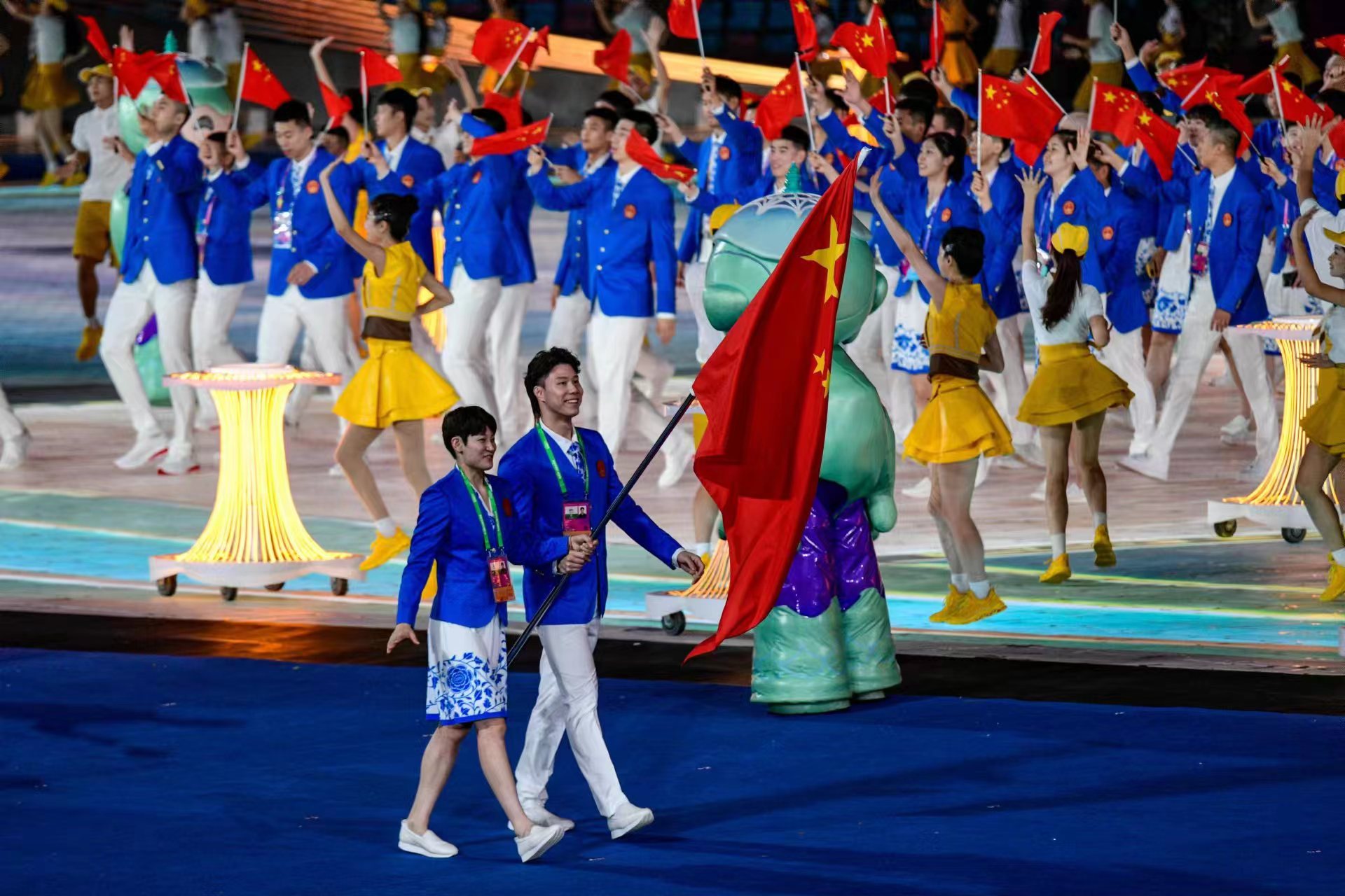 覃海洋(右)是杭州亚运会中国体育代表团旗手。劳动报记者颜筱依 资料照片