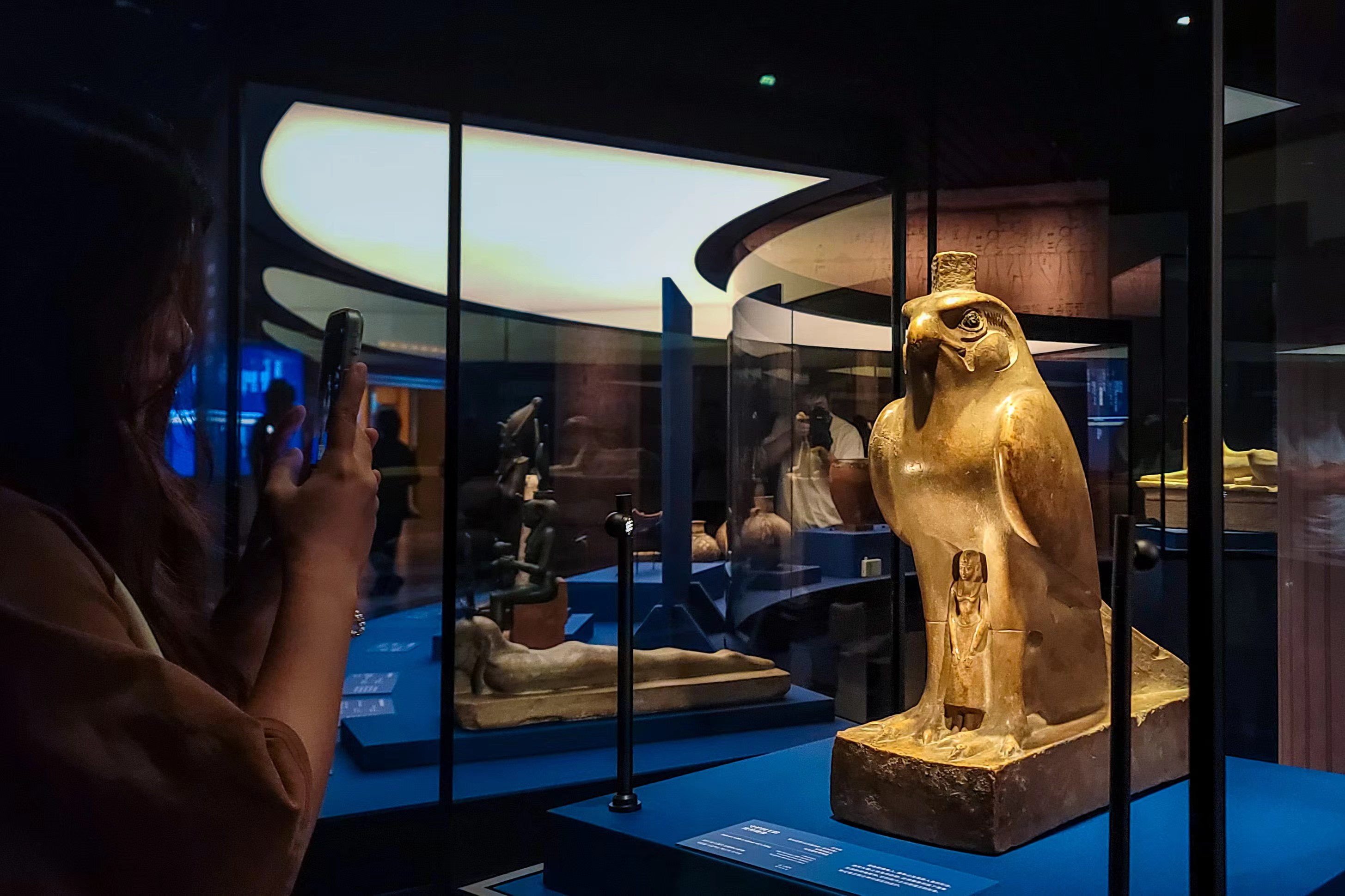 观众拍摄文物——守护国王的鹰神雕像。劳动报记者颜筱依 摄影