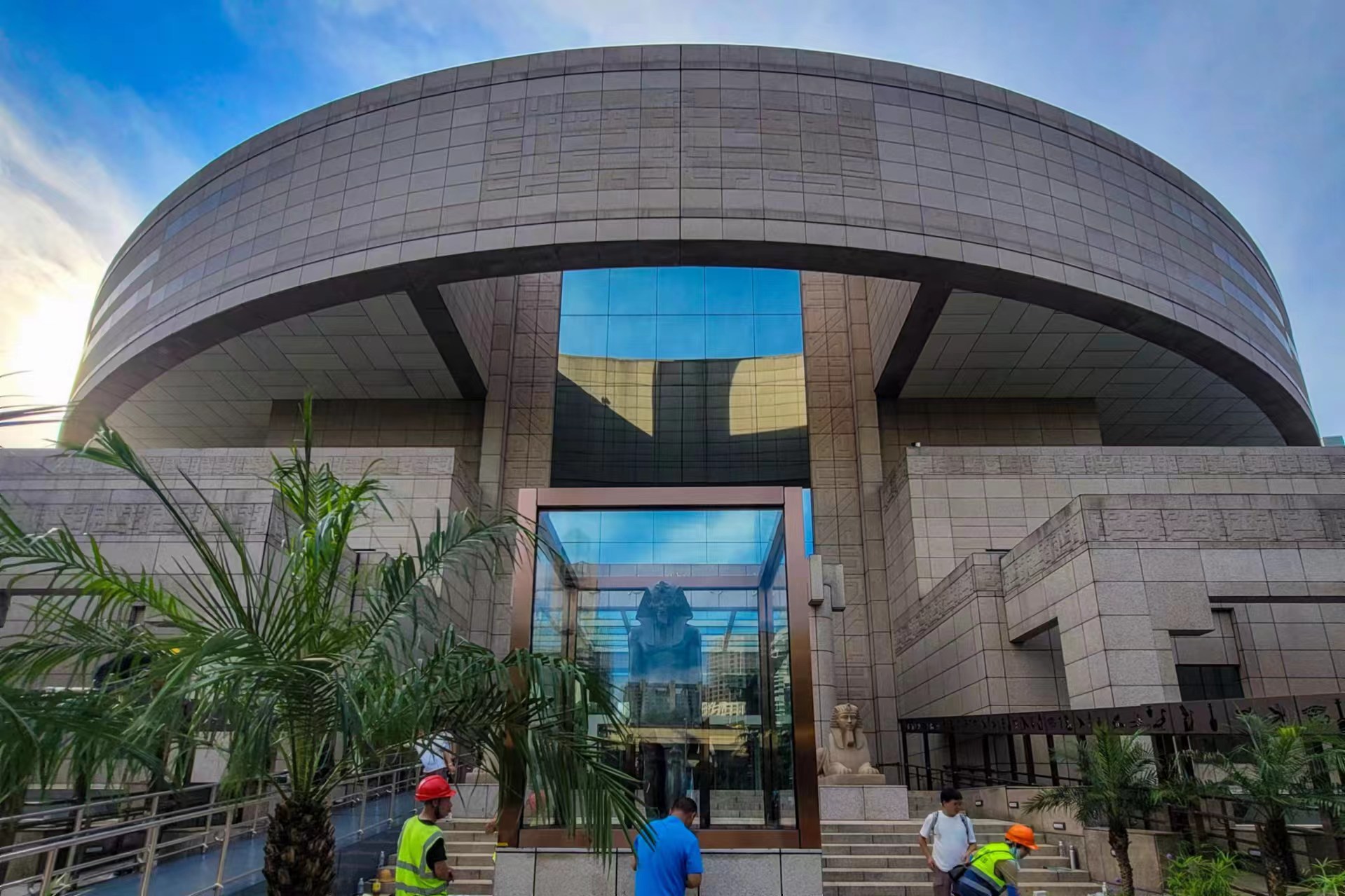 上海博物馆南门的正门处,美内普塔站像已经巍然矗立,它高2.4米,重2吨多,是此次埃及来沪最高的一件石雕,这也是上海博物馆历史上首次把文物展品放在室外进行展出。劳动报记者颜筱依 摄影