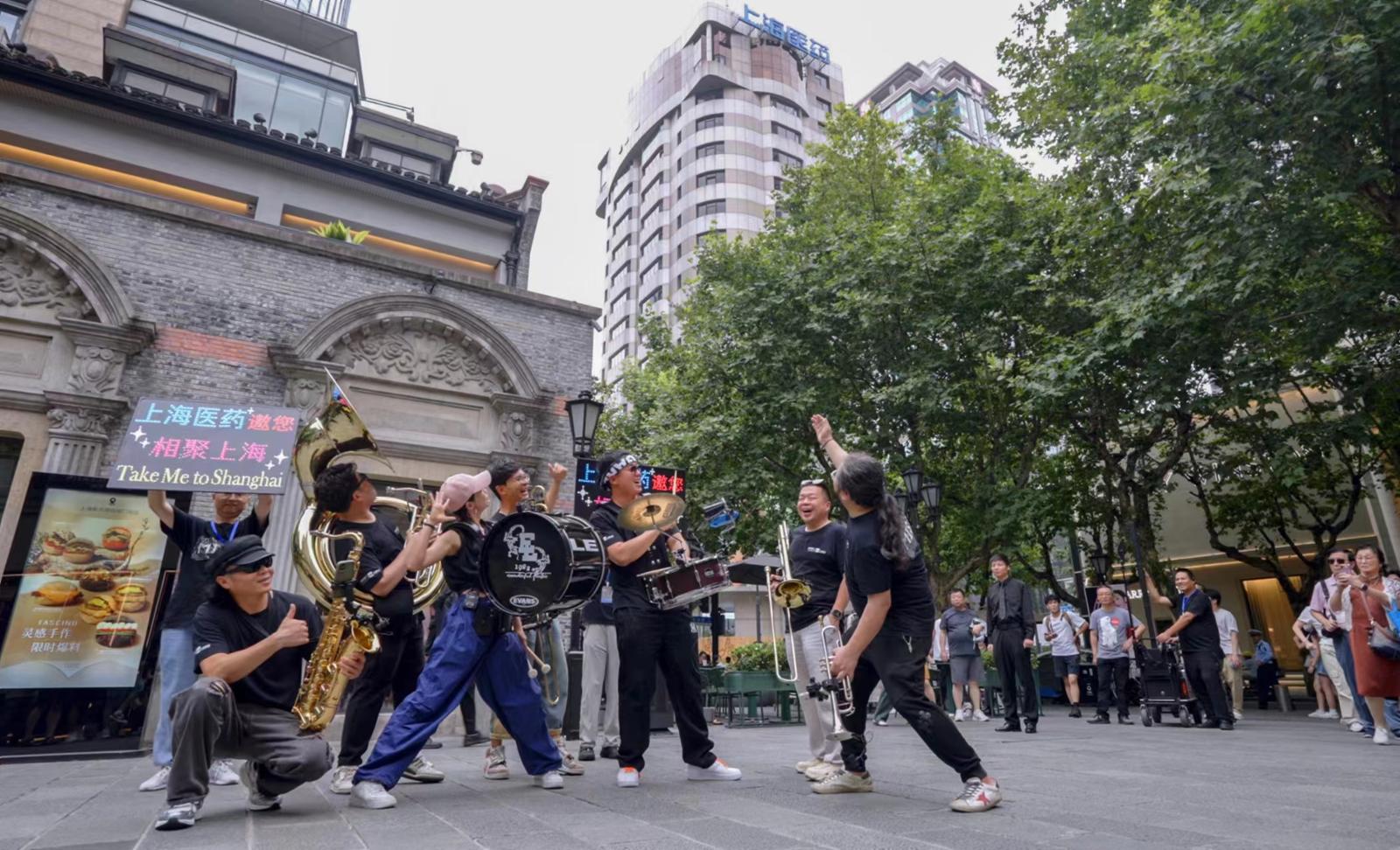 在新天地,上海交响乐团小号首席夏非和他的伙伴们组成的铜管乐队,遇到了一群来自美国的高中生,他们是在沪参加“留学上海”交流会的成员。因为热爱文艺,来自塔科马山地中学的11年级学生朱利叶斯被街头的音乐快闪深深吸引,掏出手机追着乐队拍摄视频,一旁的同伴、不同肤色的年轻人也伴着乐声自由地舞动起身体。“上海的文艺含量太浓郁了,街头演出太酷了,能在漫步游玩时看到这样的演出非常惊喜和开心,未来我愿意了解中国更多的音乐和乐队。”朱利叶斯说。
