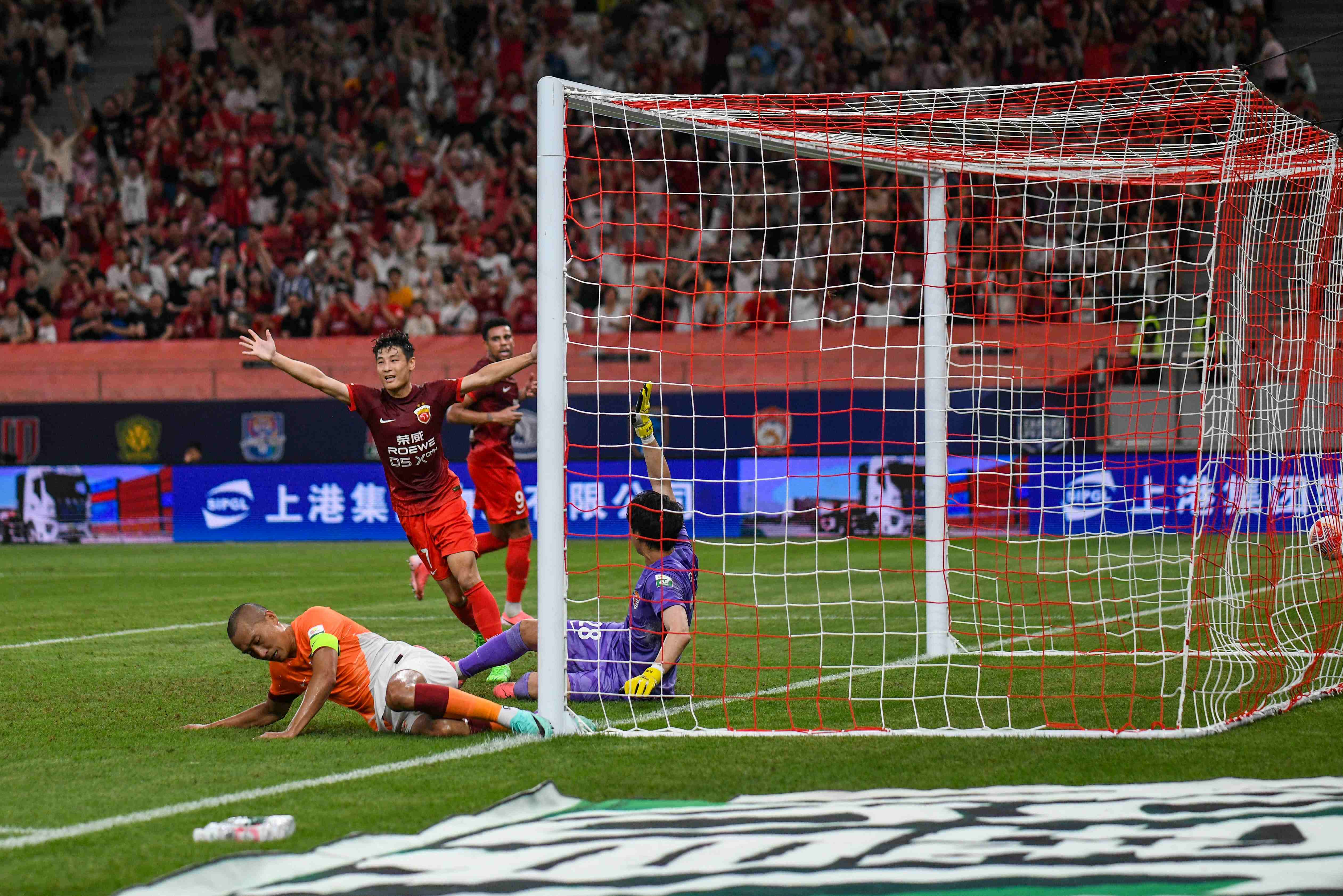 海港球员庆祝进球。劳动报记者颜筱依 摄影