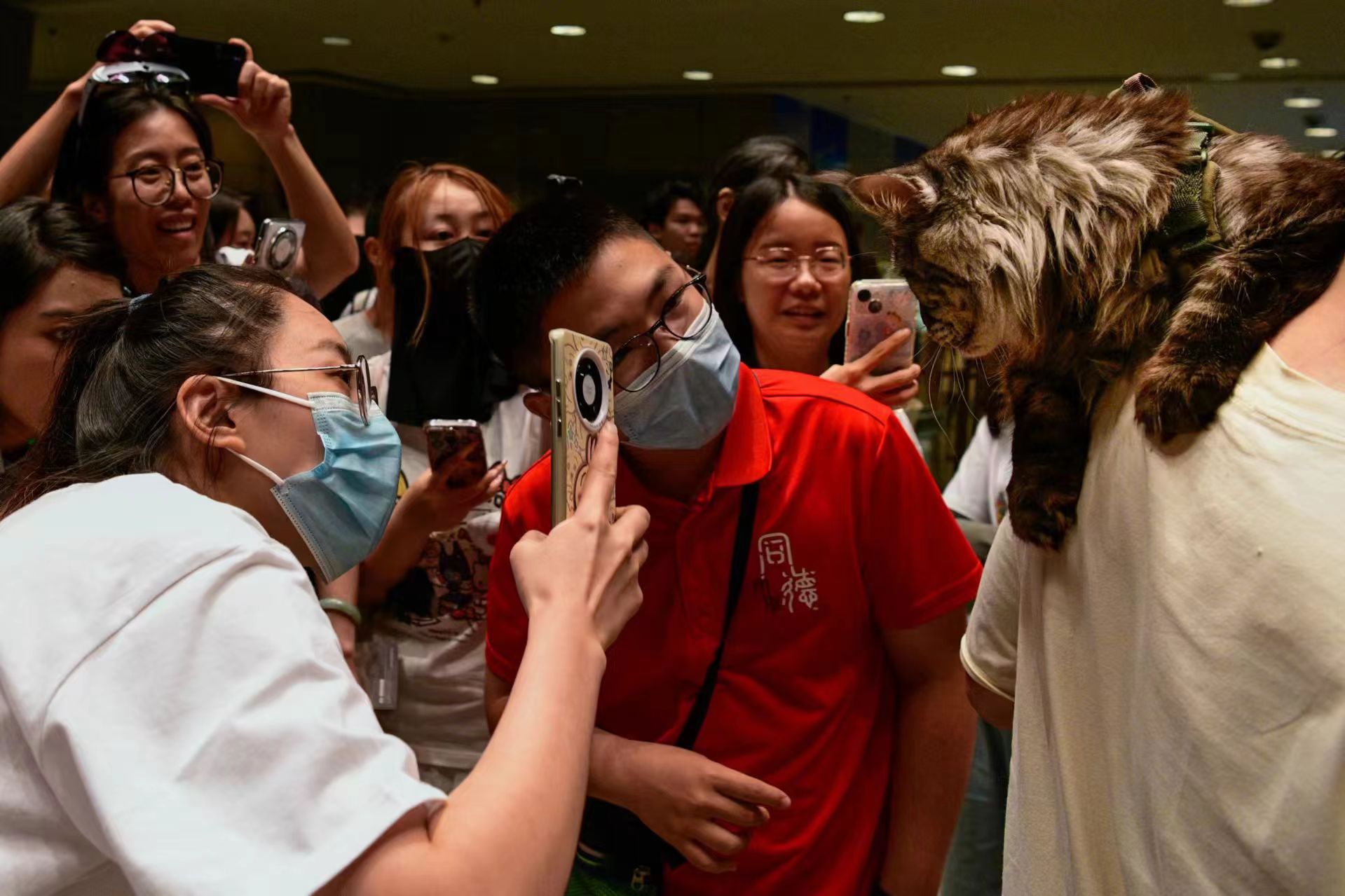 一只体型巨大的缅因猫引起众人围观。劳动报记者颜筱依 摄