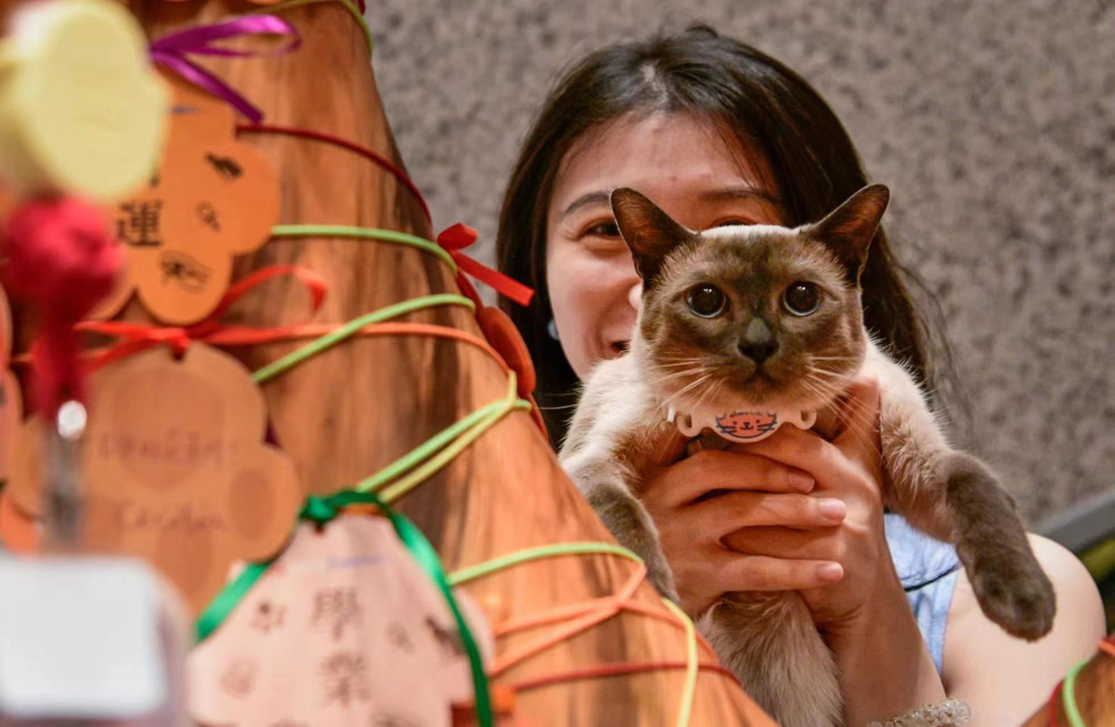 暹罗猫和主人现场合影。劳动报记者颜筱依 摄
