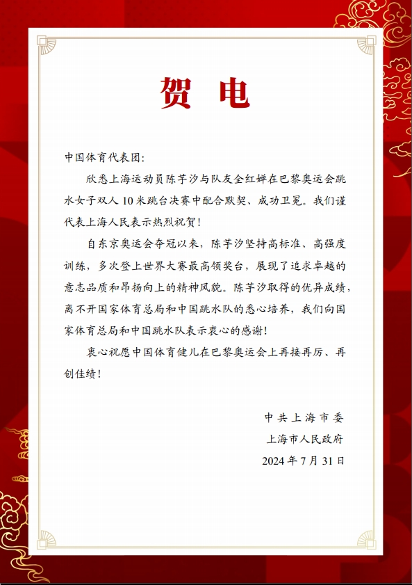 贺电表示,欣悉上海运动员陈芋汐与队友全红婵在巴黎奥运会跳水女子双人10米跳台决赛中配合默契、成功卫冕。我们谨代表上海人民表示热烈祝贺!