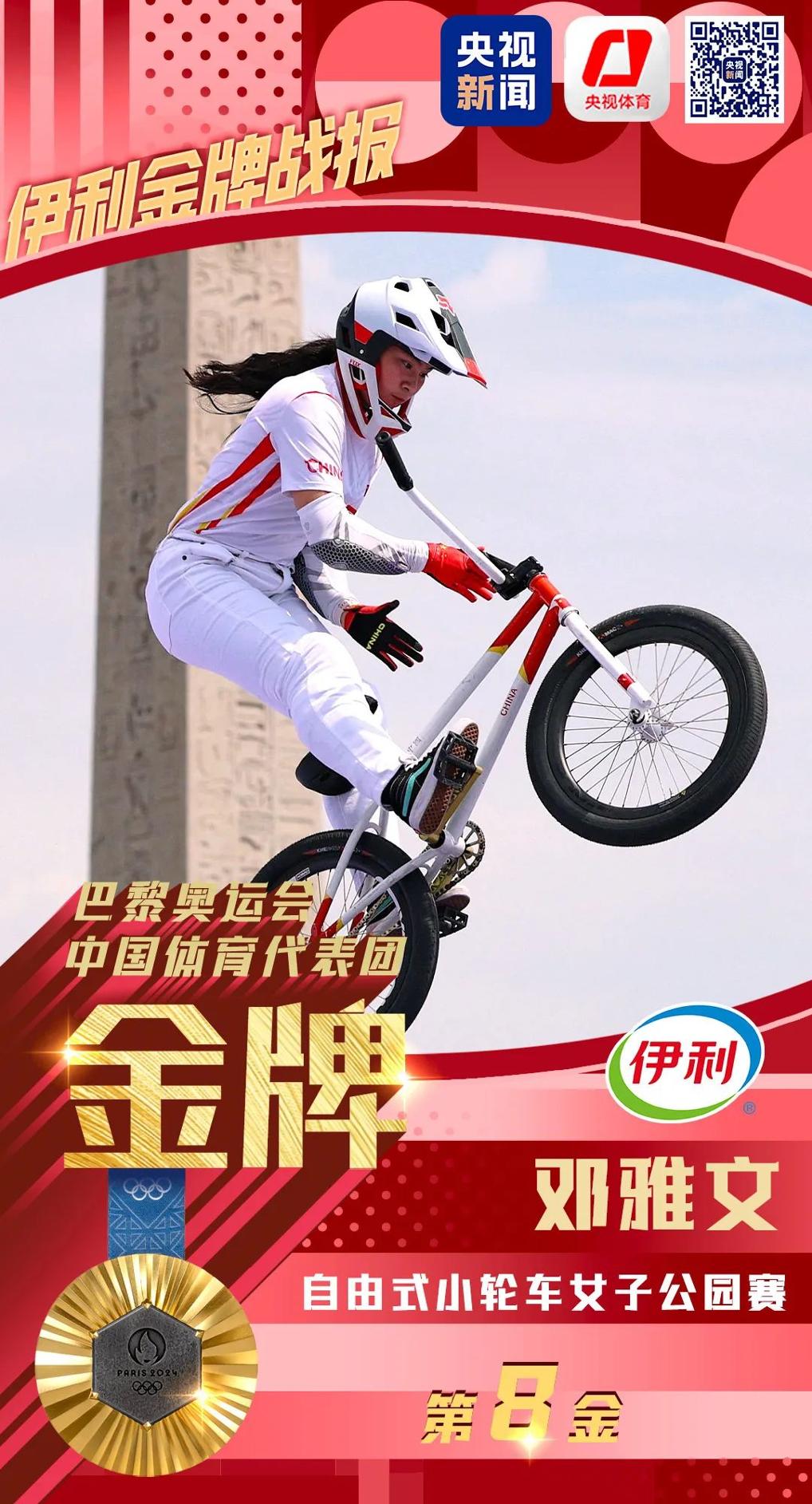 历史性的时刻!北京时间7月31日晚,在巴黎奥运会的新兴项目自由式小轮车女子决赛中,中国运动员邓雅文两轮比赛均有完美发挥,最终以92.60的高分排名第一,帮助中国队首次摘得该项目金牌,这也是中国体育代表团在巴黎奥运会的第8枚金牌。
