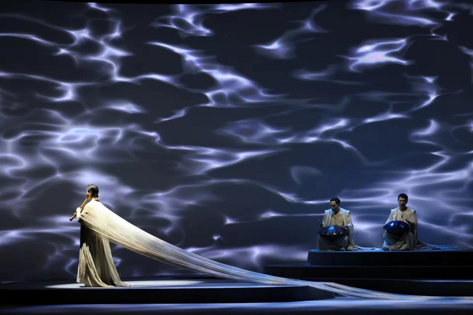 今年刚入团不久的“95后”笛箫演奏家王泽和高雅也在这一轮驻演中展露头角。《水行》中,尺八演奏家要身着10米长袍从舞台一头缓缓行至另一头,象征着流淌的时间变化,也是一条生命之路。然而一边吹奏一边负重前行,对新手而言并不简单。王泽透露,在幕后侧台,团里的前辈总会亲自为他整理衣摆,不断鼓励他“相信只有将自己与音乐、舞台融为一体时,我们所呈现出来的作品才能真正地打动到观众。”