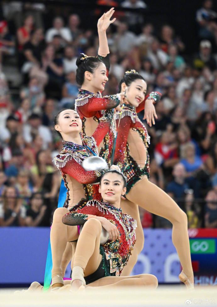 每一次的世界大赛,中国艺术体操国家队都会编排中国风的节目。东京奥运会,中国队在《飞天月舞》的伴奏下惊艳演绎“敦煌飞天”。这一次在巴黎,次轮3带2球项目中,中国队则是以一袭红装,演绎了汉唐韵味的《凤鸣凌霄》,以精准的动作、具有张力的表演诠释国风,获得32.850分,最终位列所有参赛队伍的首位。