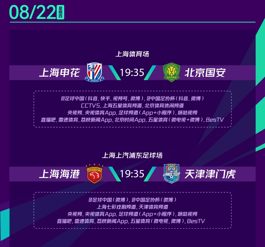 中国足球协会杯8月21日晚率先展开两场1/4决赛较量,8月22日晚上,两支上海球队海港和申花将在同一时间分别在主场迎战登门挑战的京津两强。虽然两个对手的实力很强,虽然海港和申花刚刚经历一场德比大战,并有部分主力受到伤病影响,但沪上双雄依然是更被看好的一方,如果他们都能顺利过关,在后续的半决赛当中,又将呈现球迷期待的德比大战。