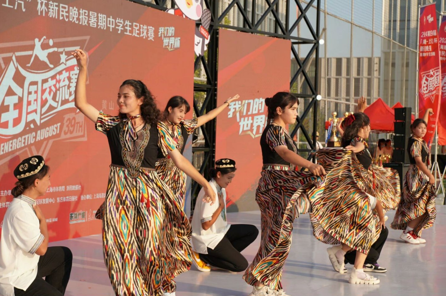 喀什六中女足和日喀则市上海实验学校的男足队员们各自带来极具地域特色的舞蹈,现场还邀请黄山赛区的队员共舞,足球联动音乐,铸就了赛场之外的友谊桥梁。