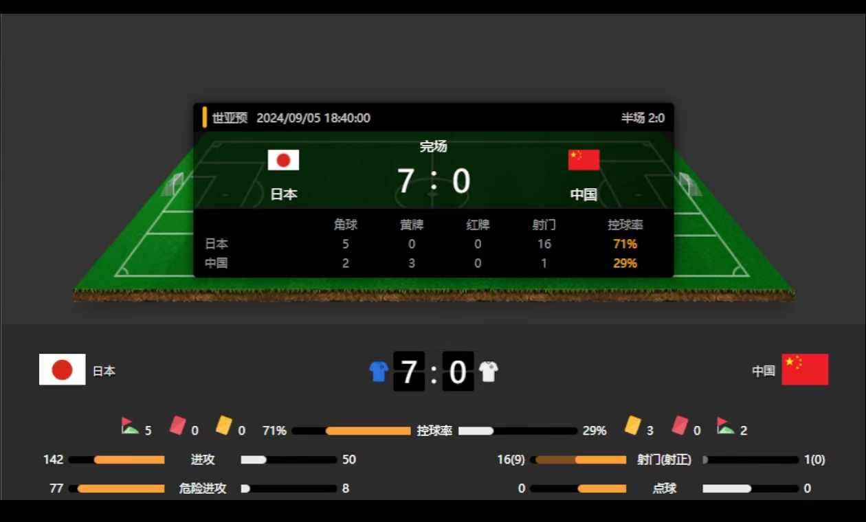 两队的技术统计更加刺眼:日本队16次射门,9次射正,142次进攻,77次威胁进攻,而中国队只有一次不知所云的射门,并且没有射正球门……唯一的领先,恐怕是黄牌数3比0。