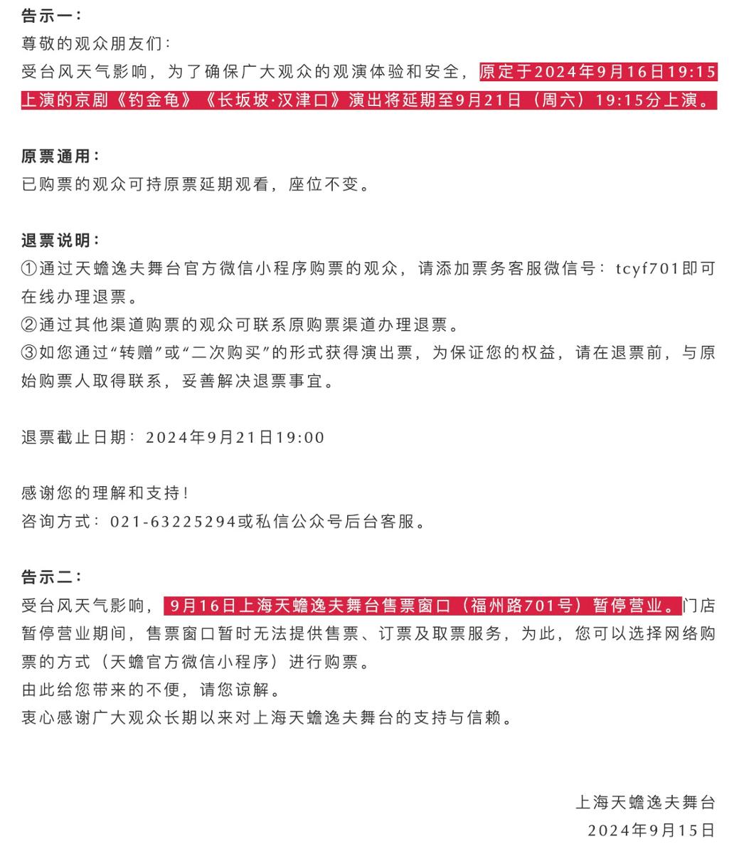 上海逸夫舞台的两场京剧演出也延期至9月21日