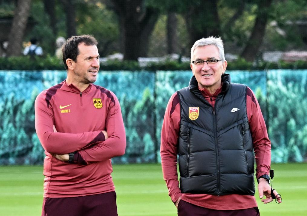 伊万(右)带队在上海训练。新华社图