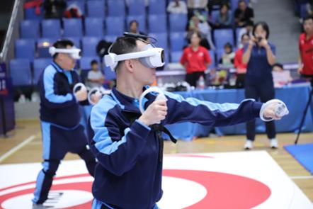 除常规的空手道比赛之外,组委会还特别设置了虚拟搏击体验板块。今天特意邀请了来自上海市救助管理二站的受助人员到现场观赛并体验虚拟搏击,这是上海市体育宣传教育中心和上海市救助管理二站共建活动之一。在两家单位职工和赛场工作人员的帮助下,受助人员两两一对,穿戴好装备,借助虚拟格斗电子设备,让参与者通过虚拟现实(VR)设备,体验到接近真实的格斗比赛场景。在安全有序的环境下,受助人员参与运动,体验运动乐趣,为融入社会、走进社会奠定了坚实的基础。
