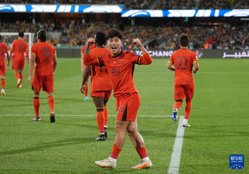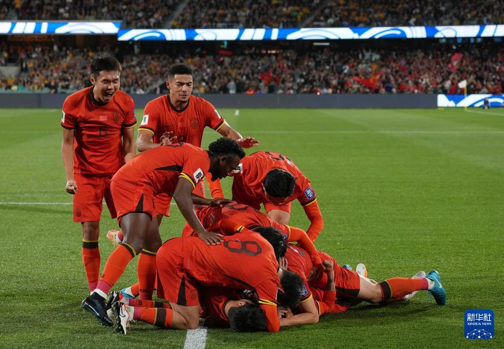 中国队庆祝进球。新华社图