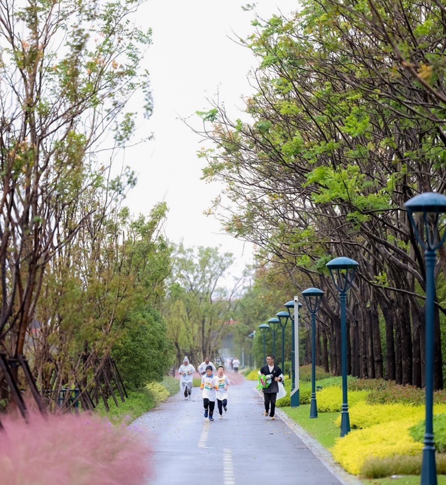 如今的梦享公园,绿环双线环绕、设施完备:滨水绿带新增的骑行漫步双道封闭连贯,串联起12个景观打卡点;沿途依次树立了从1公里到10公里的标识牌,增设了更衣室、卫生间、休息驿站等各类服务设施。公园一侧的川迪河则是水上运动爱好者的天堂,龙舟、赛艇等活动贯穿全年,跑道与河道交相辉映,1O公里滨水带串起健康生活。